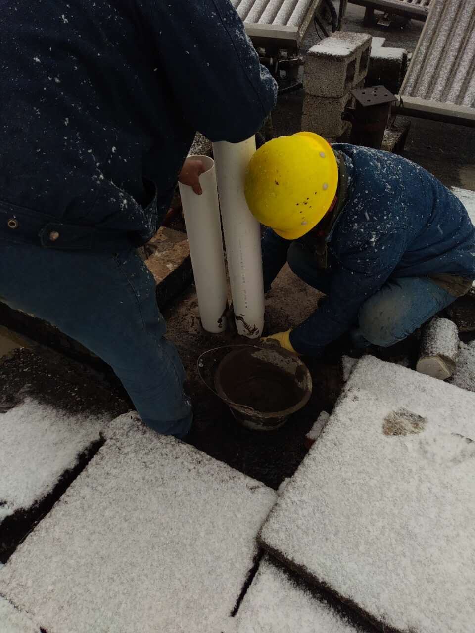 樓頂作業(yè)人員根據(jù)施工需要,或蹲著、或彎著腰、或趴在冰涼的地板上,有的在地面搬運(yùn)材料,有的在樓道里安裝環(huán)管,有的在樓頂進(jìn)行套管密封,并采取倒班作業(yè)的方式進(jìn)行。