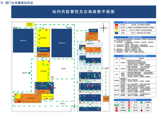 加壓站在站內(nèi)全面推行安全風(fēng)險分級管控和隱患排查治理雙重預(yù)防機制,對作業(yè)現(xiàn)場可能存在的安全風(fēng)險進行全面識別、評估和分級,同時制作風(fēng)險四色圖和風(fēng)險告知牌,將安全風(fēng)險等級從高到低按區(qū)域依次劃分為重大、較大、一般和低風(fēng)險,分別用紅、橙、黃、藍四種顏色標(biāo)示,明確不同區(qū)域的風(fēng)險等級、防范措施和相關(guān)責(zé)任人,以最直觀的方式展示作業(yè)現(xiàn)場的安全風(fēng)險及防范措施。根據(jù)風(fēng)險四色圖和風(fēng)險告知牌外來人員能了解所處區(qū)域可能存在的風(fēng)險,做好自身防護,施工人員則可以做好施工前的風(fēng)險管控,降低作業(yè)過程中的安全風(fēng)險。