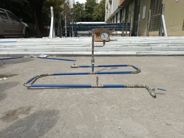 圖為技術人員正在對薄壁不銹鋼管道進行打壓測試