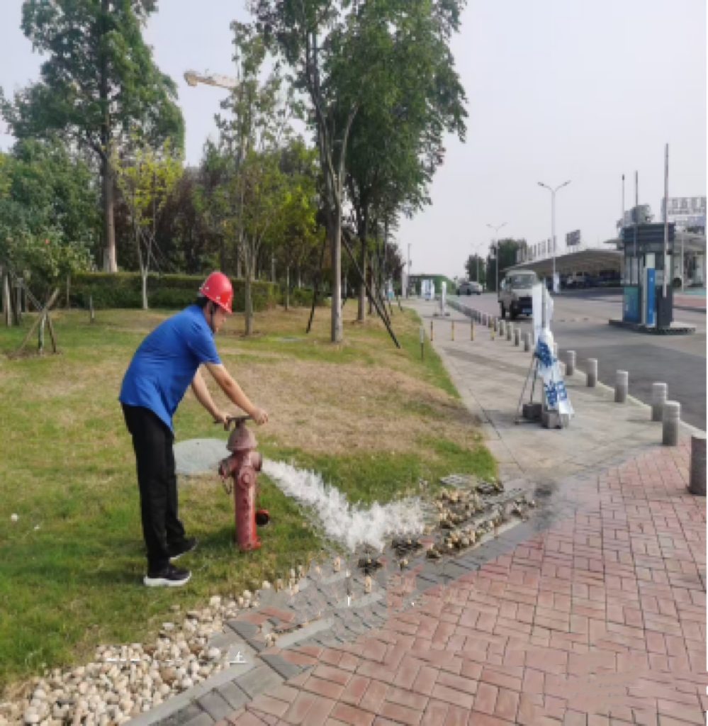 圖為工作人員檢查消防設(shè)施完好性