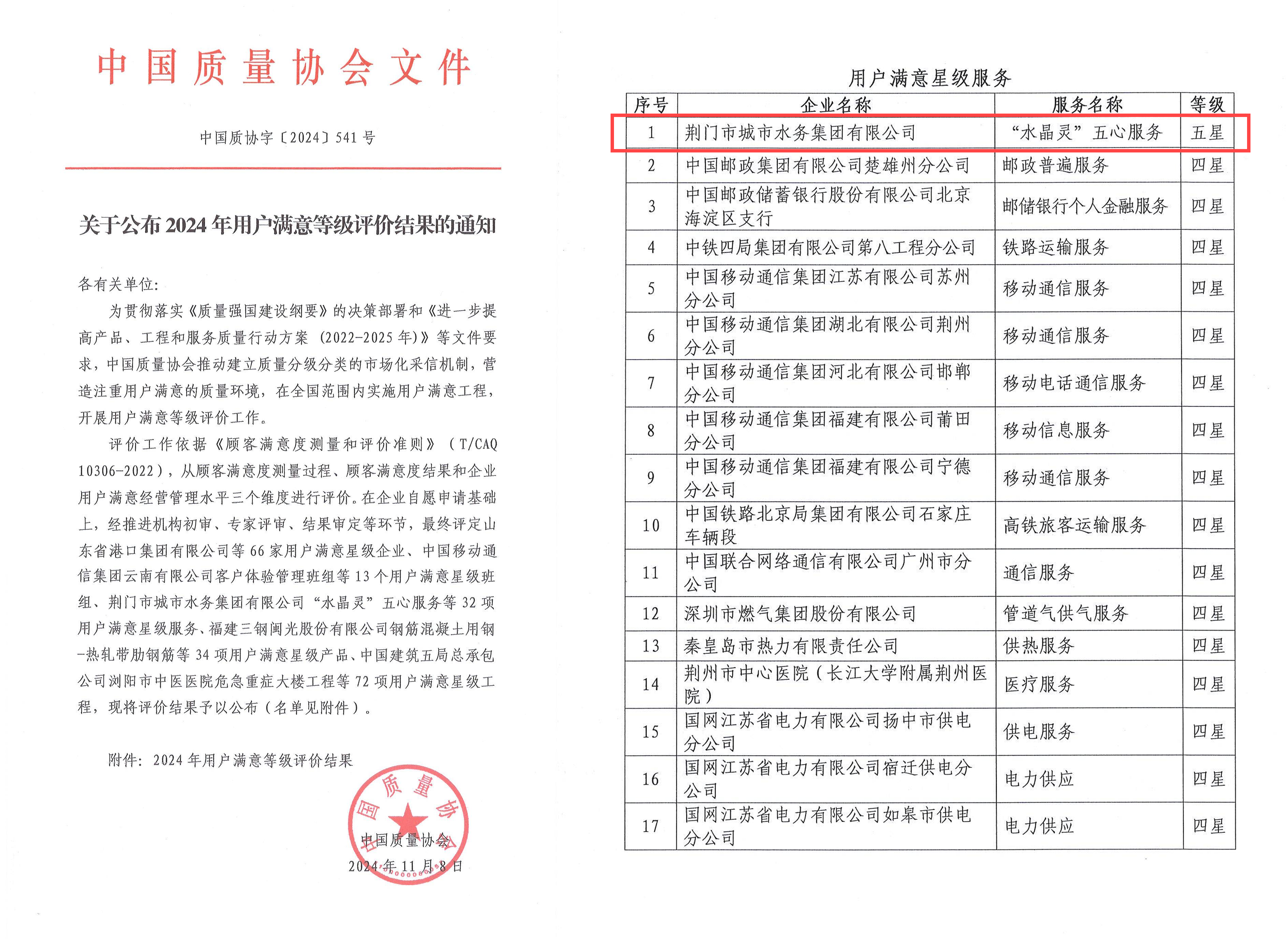 11月8日,中國質(zhì)量協(xié)會公布2024年用戶滿意等級評價結(jié)果,荊門市城市水務集團有限公司(以下簡稱“集團”)以“水晶靈”五心服務模式為特色,成為全國唯一一家獲評服務類五星的企業(yè),標志著在供水服務領(lǐng)域已經(jīng)成為全國標桿。