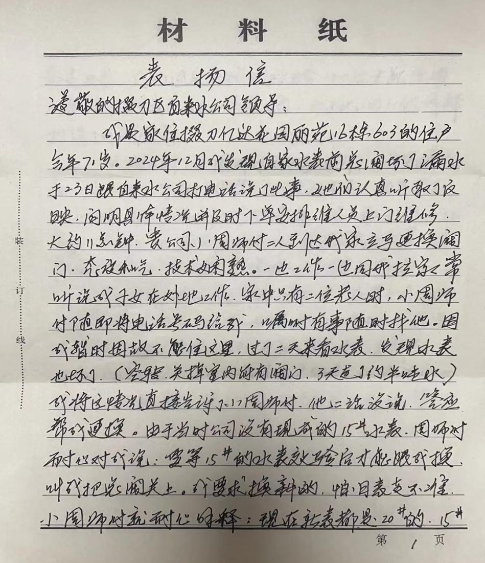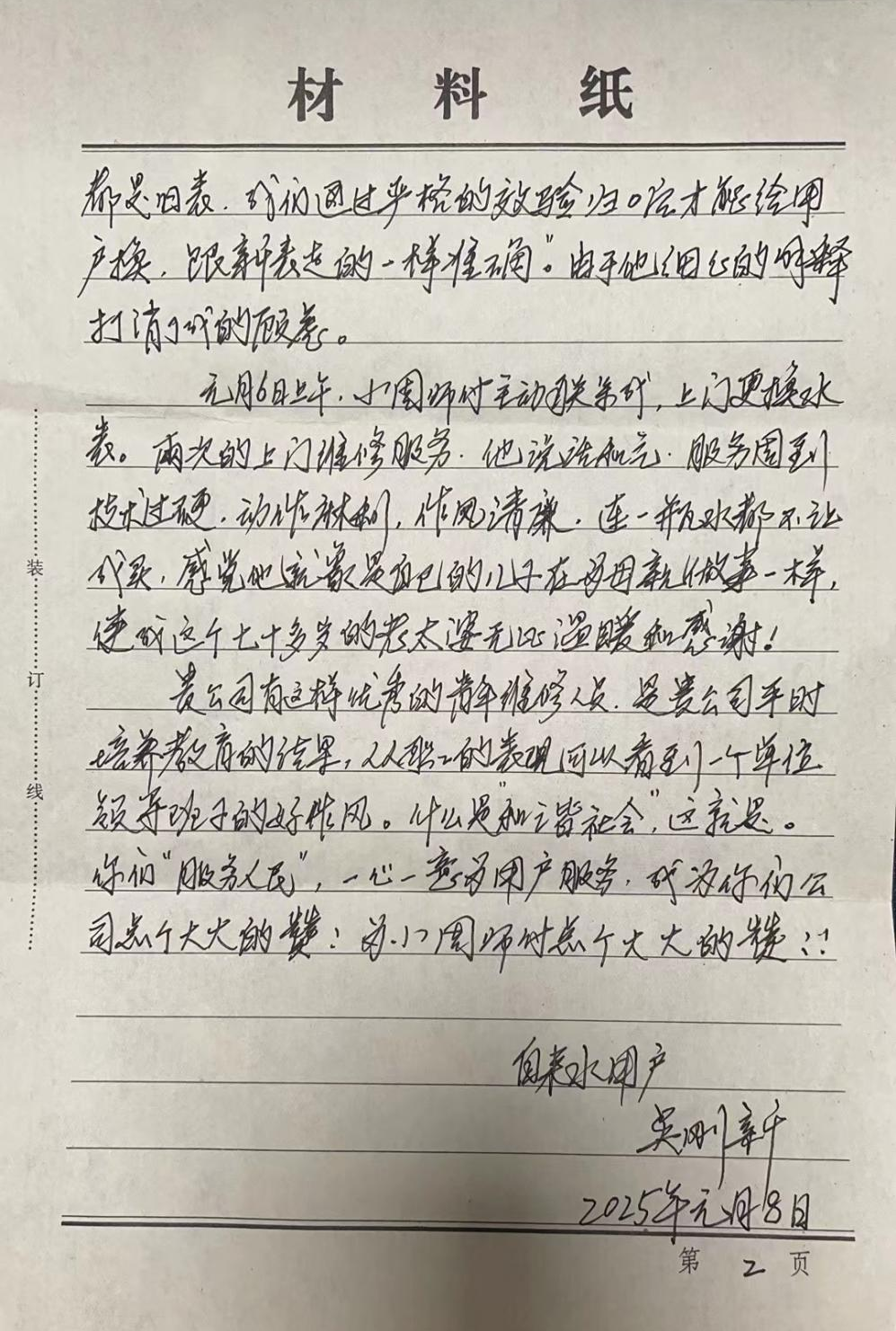 在表揚信中,老人深情表達:“家中只有我們兩位老人,水務(wù)集團的維修人員就像我們的兒子一樣,他說話和氣,服務(wù)周到,技術(shù)過硬,動作麻利,作風清廉,讓我們感到無比溫暖。”