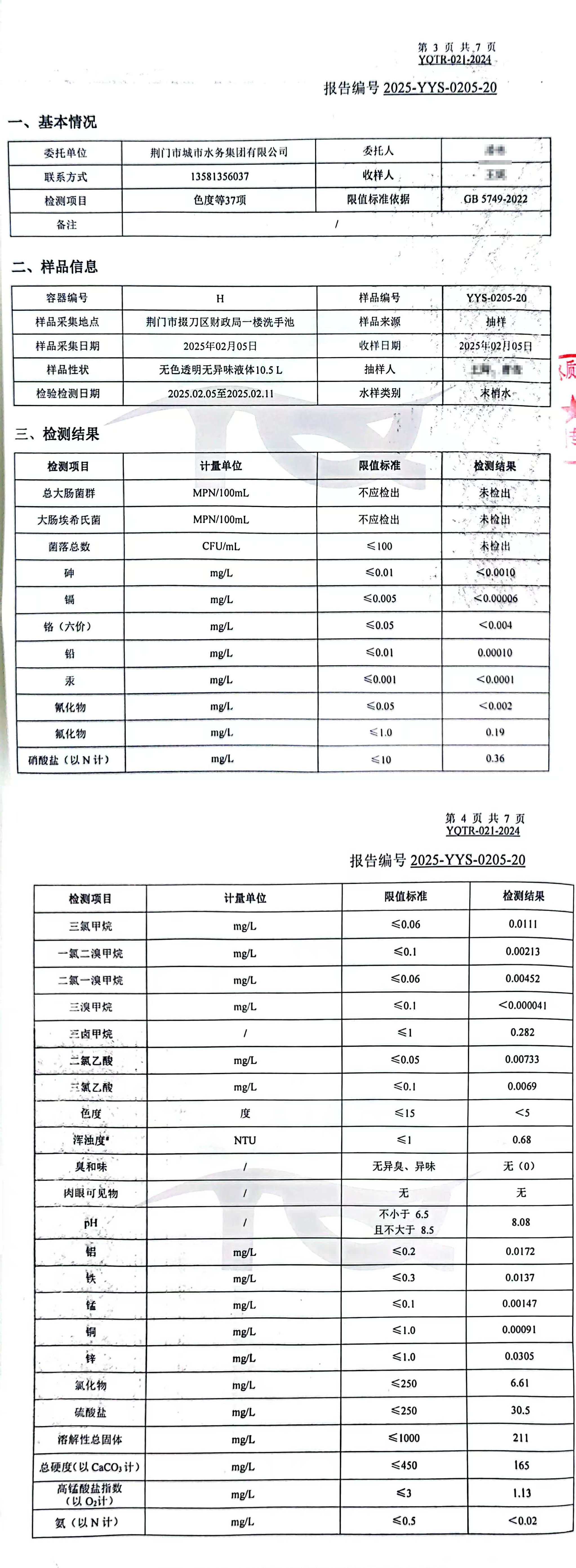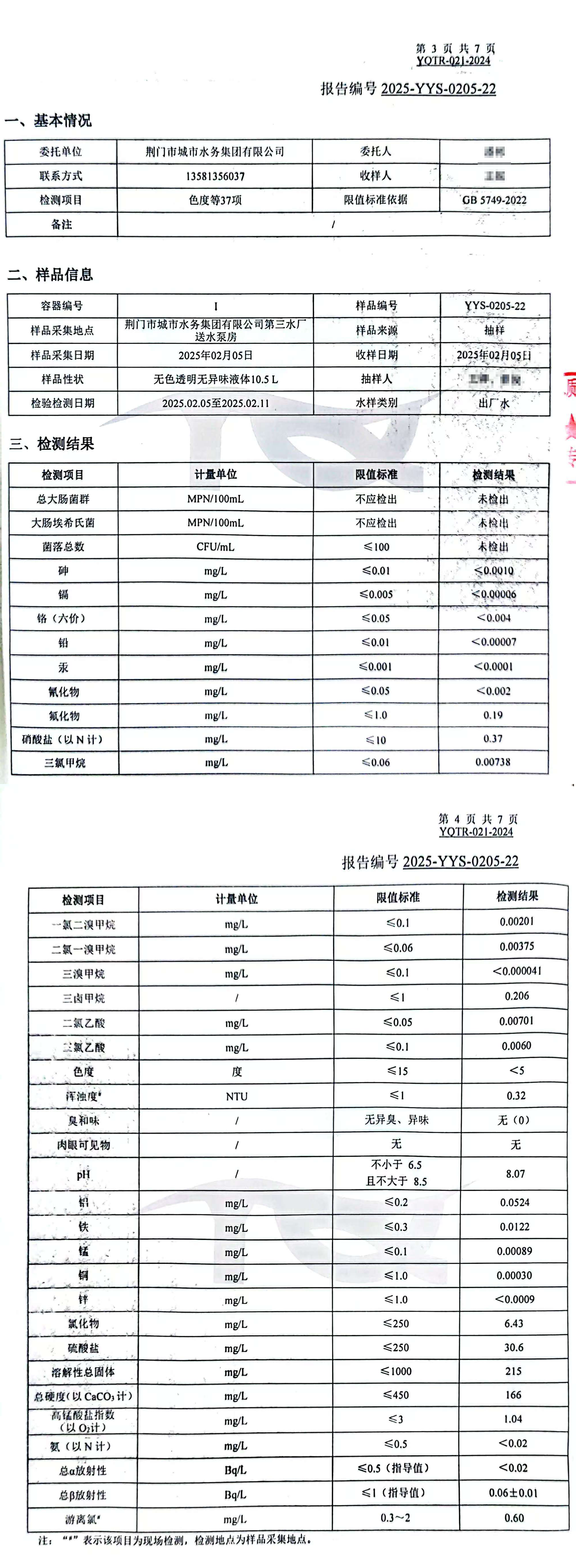 荊門水務(wù)集團(tuán)始終堅(jiān)持用戶至上服務(wù)宗旨,將水質(zhì)安全作為首要工作,通過三級(jí)水質(zhì)檢測(cè),保障從源頭到龍頭水質(zhì)達(dá)標(biāo)。自本月起,集團(tuán)將定期公布水質(zhì)檢測(cè)結(jié)果,歡迎廣大用戶監(jiān)督!