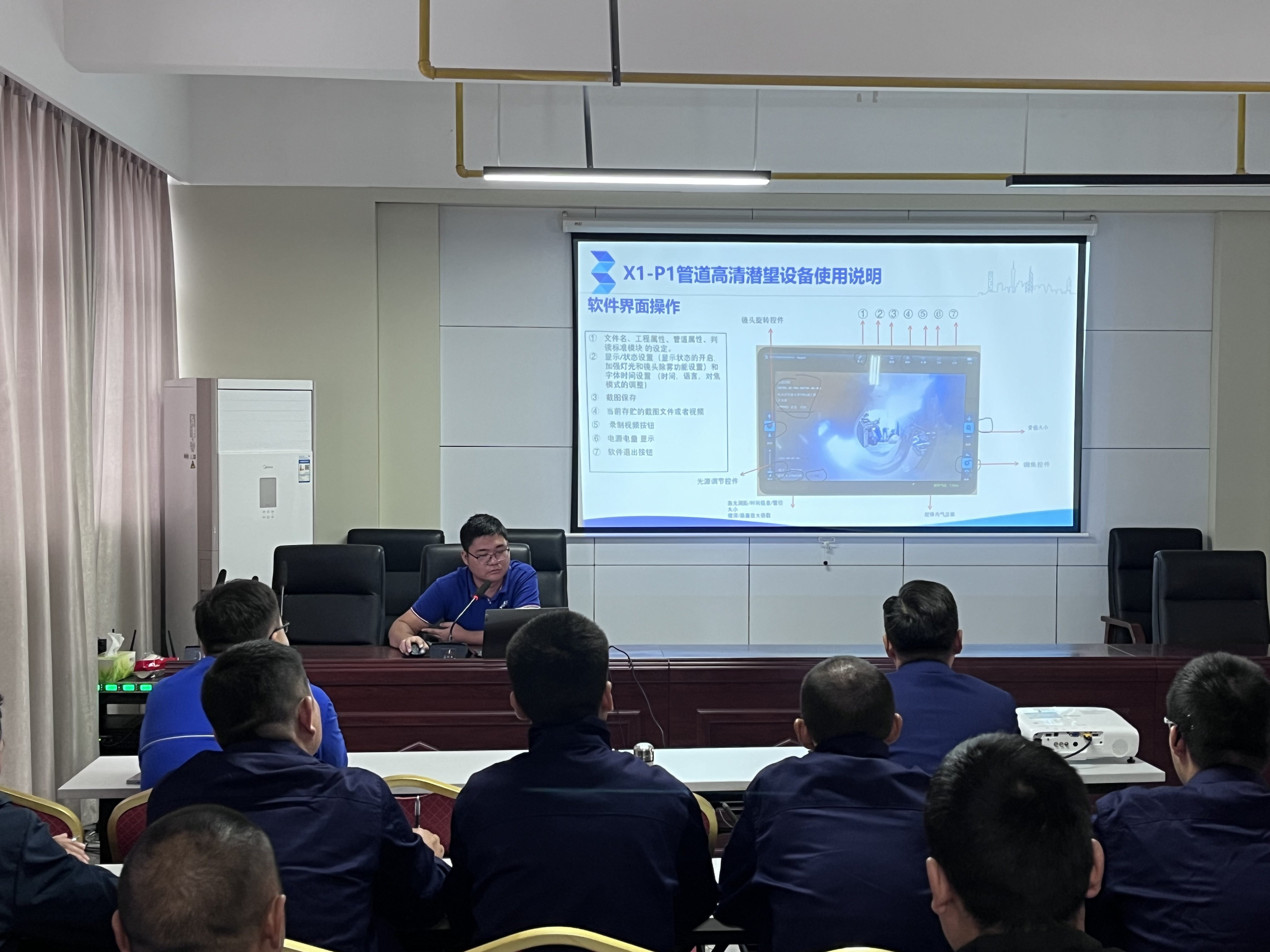 本次培訓(xùn)采用“理論+實操”相結(jié)合模式。理論授課環(huán)節(jié),授課老師圍繞CCTV管道檢測機(jī)器人工作原理、設(shè)備結(jié)構(gòu)組成、操作規(guī)范及安全注意事項等內(nèi)容,通過PPT展示和應(yīng)用案例開展系統(tǒng)授課。參訓(xùn)員工全神貫注,詳細(xì)記錄操作要點,積極與老師互動交流,對這位“新伙伴”有了初步的理論認(rèn)知。