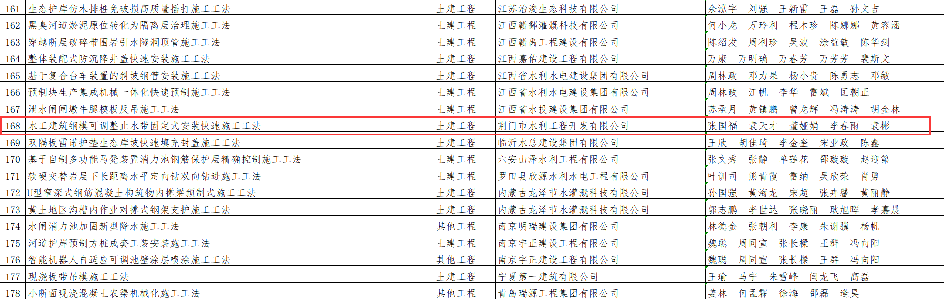 近日,中國水利工程協(xié)會公布了2025年度水利行業(yè)工法名單,荊門市城市水務集團有限公司下屬單位荊門市水利工程開發(fā)有限公司(以下簡稱“荊門水發(fā)”)申報的“水工建筑鋼??烧{整止水帶固定式安裝快速施工工法”順利通過評審,正式被確認為中國水利行業(yè)工法,為水利工程標準化、高效化建設提供了有力支撐。