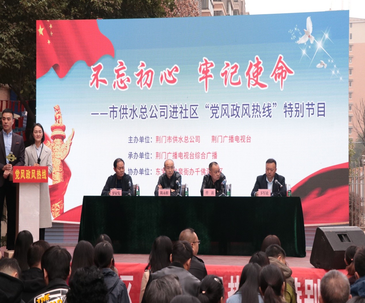 11月 6日上午,由荊門市供水總公司和荊門廣播電視臺聯(lián)合舉辦的“荊門供水進社區(qū)‘黨風政風熱線’特別節(jié)目”在荊門千佛洞社區(qū)舉行。市供水總公司黨委書記、總經(jīng)理陳永根帶領領導班子相關成員參加節(jié)目現(xiàn)場(網(wǎng)絡)直播,圍繞“不忘初心、牢記使命”主題教育,傾聽民情民意,接受現(xiàn)場問政,回應百姓訴求,解決用戶難題。