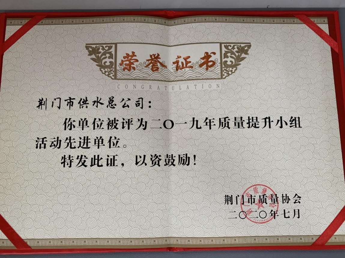 7月16日,荊門市第十五次質(zhì)量提升小組代表會議召開。會上,市供水總公司被評為2019年質(zhì)量提升小組活動先進(jìn)單位,其中發(fā)布的“縮短掇刀中壓區(qū)停水時間”和“提高廠站出水水質(zhì)”兩項QC成果獲一等獎,“提高廠站設(shè)備巡查時實率”QC成果獲二等獎,公司黨委委員、副總經(jīng)理被評為卓越領(lǐng)導(dǎo)者,生產(chǎn)安全部經(jīng)理劉昕平被評為優(yōu)秀推進(jìn)者。