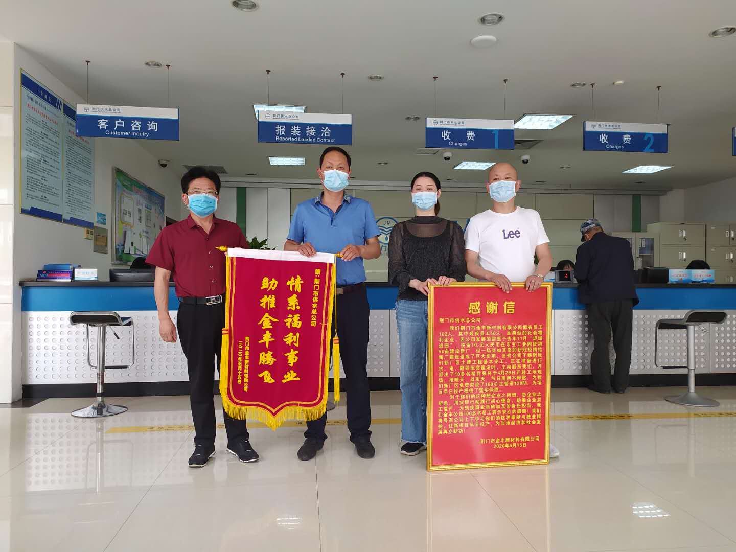 5月15日,金豐公司總經(jīng)理袁家群和東寶區(qū)工商聯(lián)相關(guān)負(fù)責(zé)人來(lái)到市供水總公司,送上感謝信和寫(xiě)有“情系福利事業(yè) 助推金豐騰飛”字樣的鮮艷錦旗。