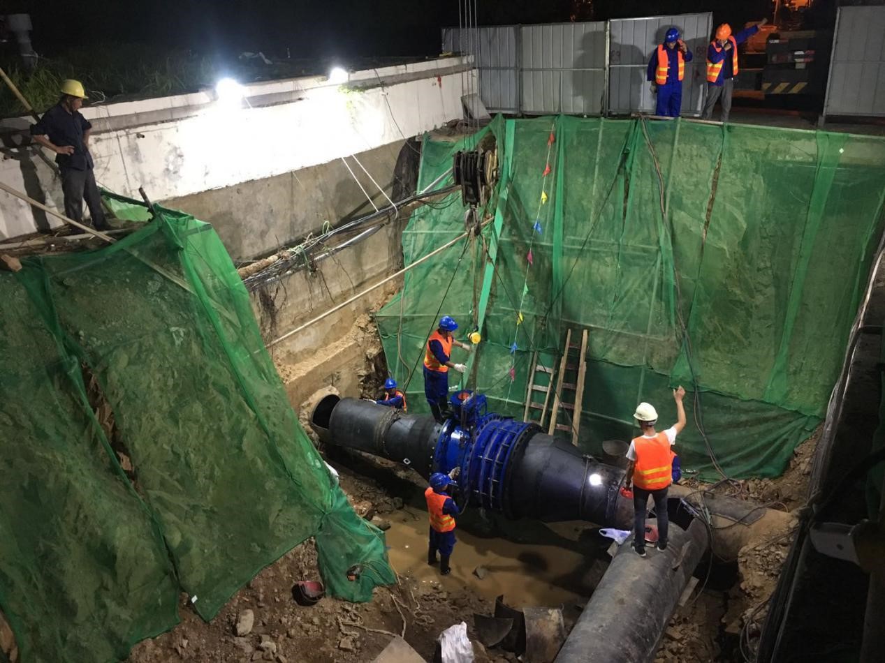 20日晚10時(shí),項(xiàng)目現(xiàn)場管理人員強(qiáng)化工序銜接,緊盯現(xiàn)場監(jiān)督,施工作業(yè)人員挑燈夜戰(zhàn),施工隊(duì)伍兵分三路,密切協(xié)調(diào)配合,分別對DN1200、DN1000鋼管共5處碰頭點(diǎn)進(jìn)行施工,管道切割、排水、吊裝、安裝閥門、焊接……施工現(xiàn)場井然有序,一道道工序推進(jìn)有條不紊,不一會(huì)兒工人們的汗水都濕透了全身。21日凌晨2:00突降暴雨,施工人員“硬核”表現(xiàn),克服惡劣天氣的影響,在水中連續(xù)辛勤作業(yè)近10個(gè)小時(shí),碰頭任務(wù)于21日8時(shí)順利完工。