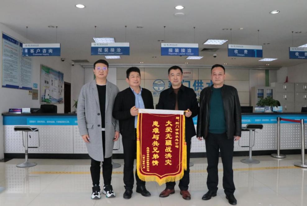 11月20日上午,恩施市自來(lái)水公司總經(jīng)理袁進(jìn)一行6人專程趕到荊門(mén),向市供水總公司在恩施遭遇五十年一遇特大洪澇災(zāi)害的危難時(shí)刻給予傾情付出和無(wú)私幫助表示感謝,并贈(zèng)送寫(xiě)有“大愛(ài)無(wú)疆戰(zhàn)洪災(zāi) 患難與共兄弟情”的錦旗。